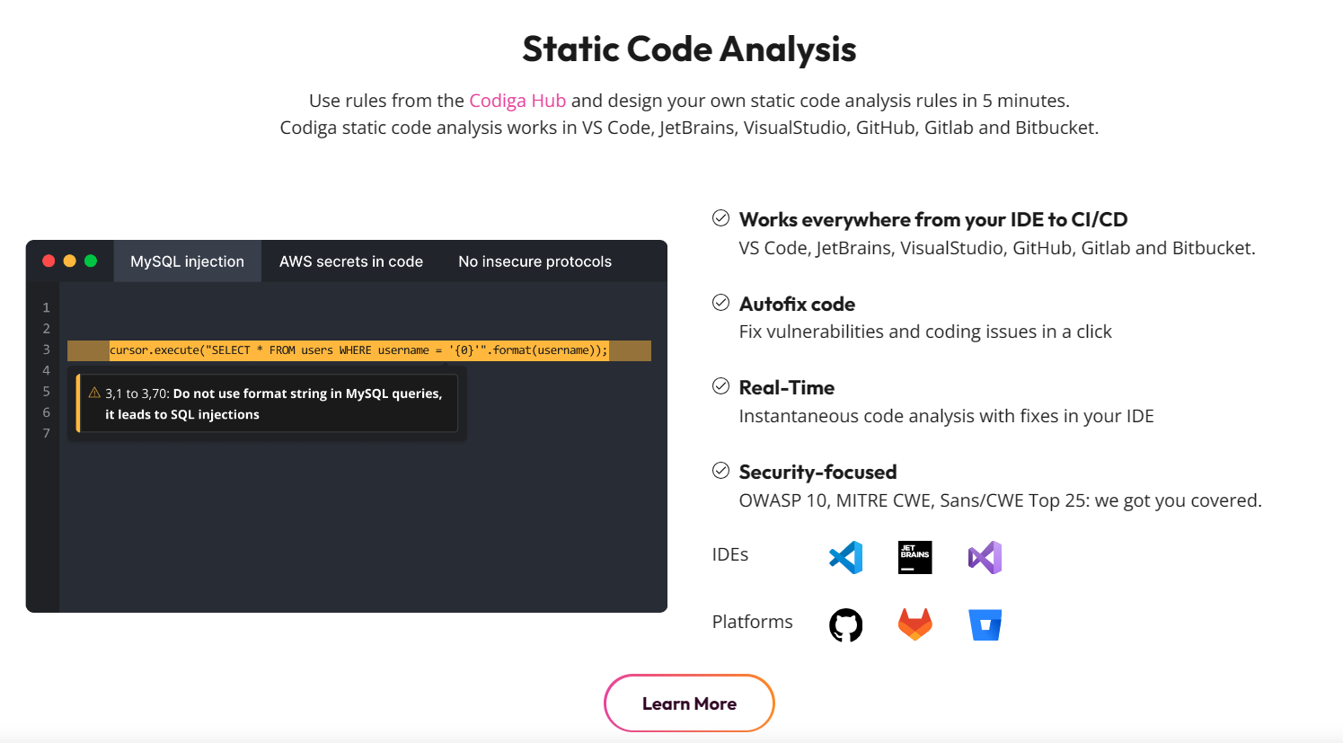 1.可定制的静态代码分析:Codiga允许用户创建自定义静态代码分析规则,并利用Codiga Hub中的现有规则。根据特定代码库和需求定制分析。