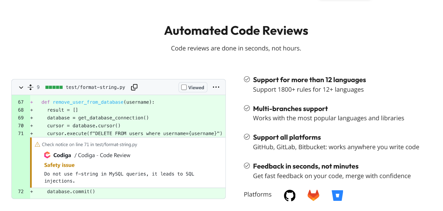 4.自动化代码审查:Codiga对超过12种编程语言进行全面的代码分析,并提供1800多条规则。轻松检测潜在问题并优化代码。