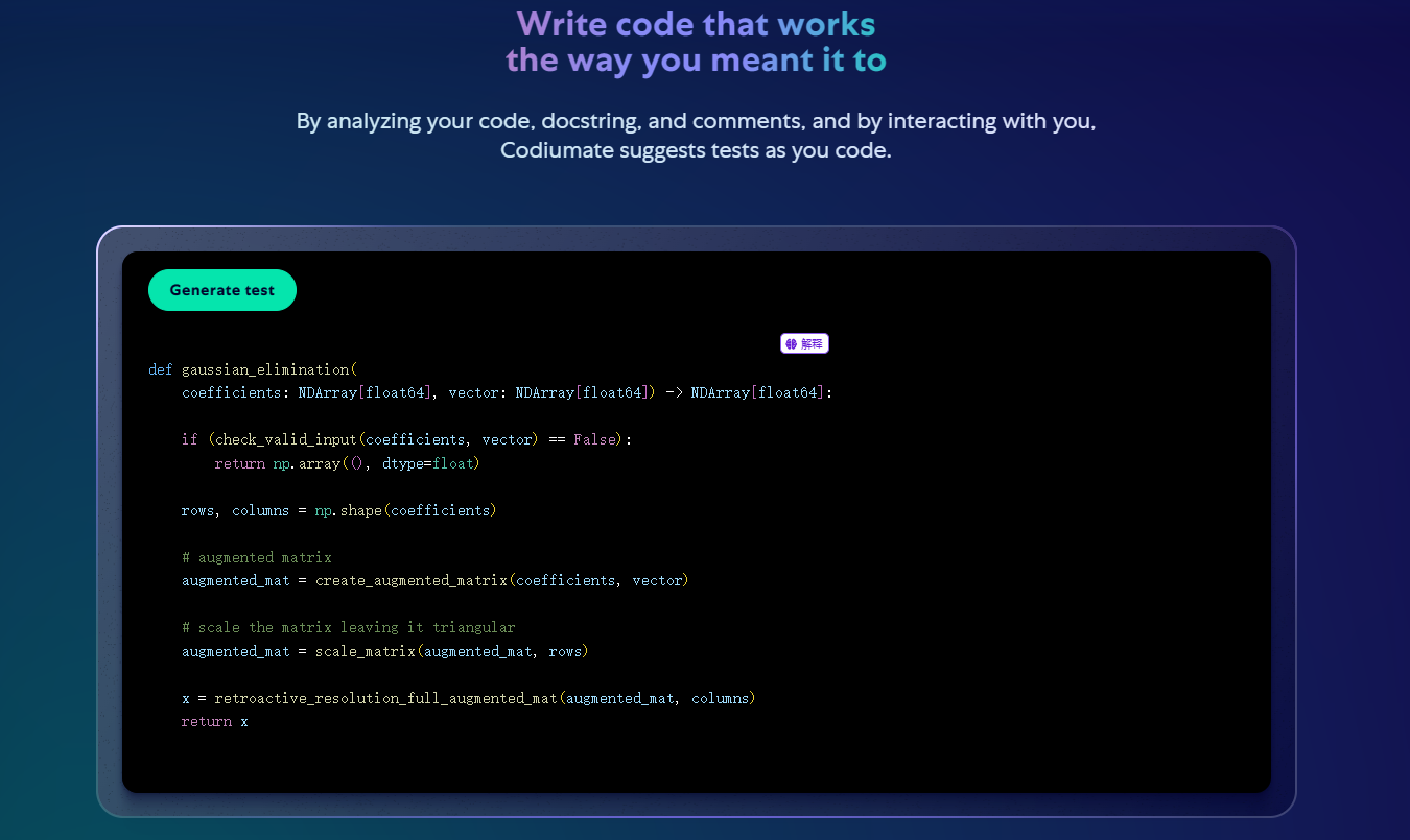 4.编写按预期方式运行的代码:通过分析代码、文档字符串和注释,以及与用户交互,Codiumate会在编码时建议测试。