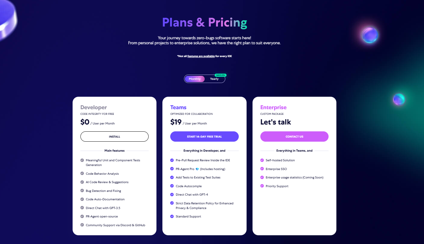CodiumAI 对个人开发者免费,对团队和企业推出付费计划,支持月付和年付,年付享有最高21%的折扣。