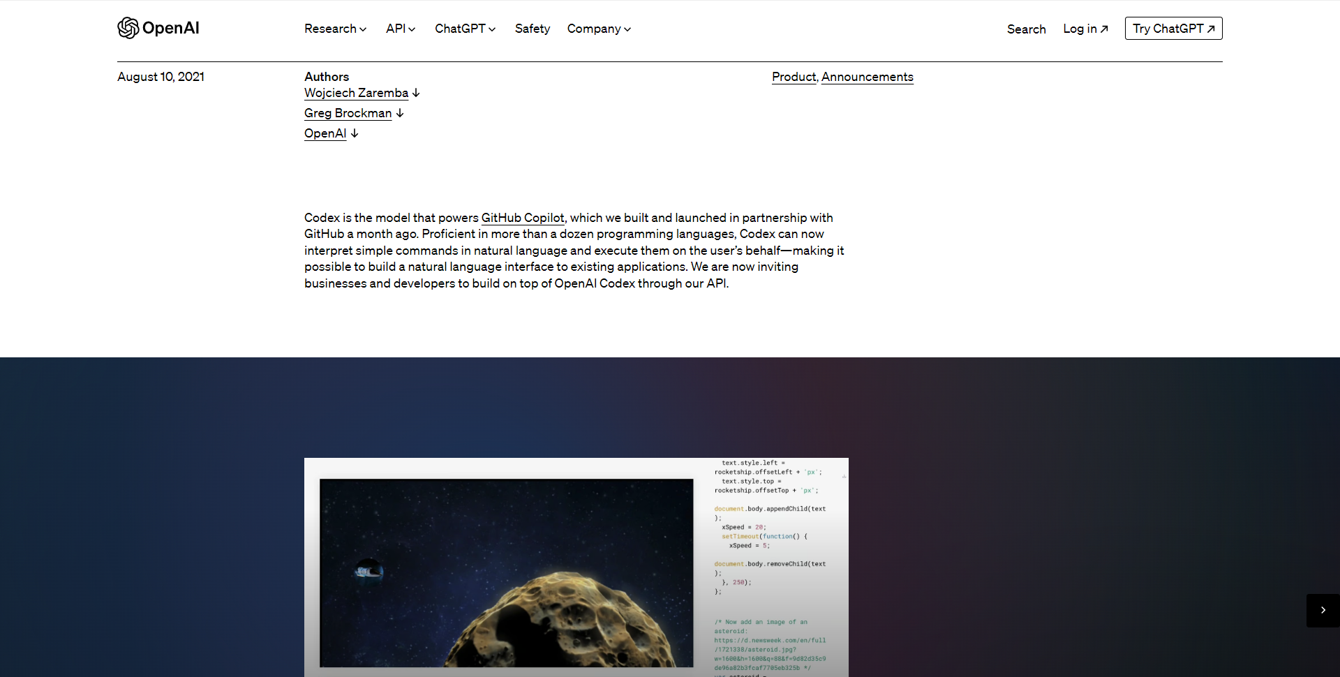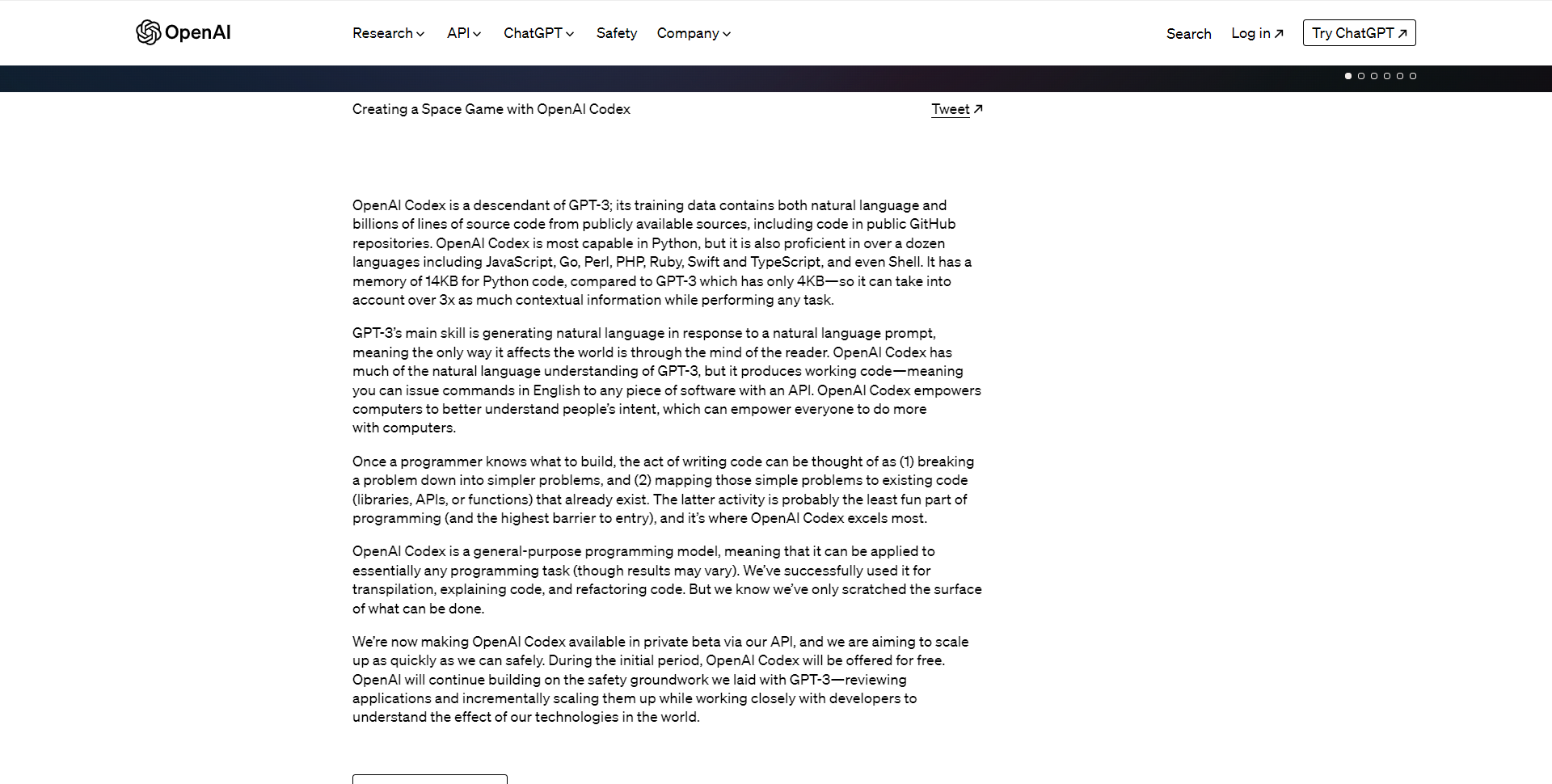 它用于为 GitHub Copilot(一种编程自动完成工具)提供支持。Codex 是 OpenAI 的 GPT-3 模型的后代,经过微调以用于编程应用程序。OpenAI 已发布内测版 Codex API。Codex 基于 GPT-3(一种基于文本训练的神经网络),还接受了来自 5400 万个 GitHub 存储库的 159 GB Python 代码的训练。