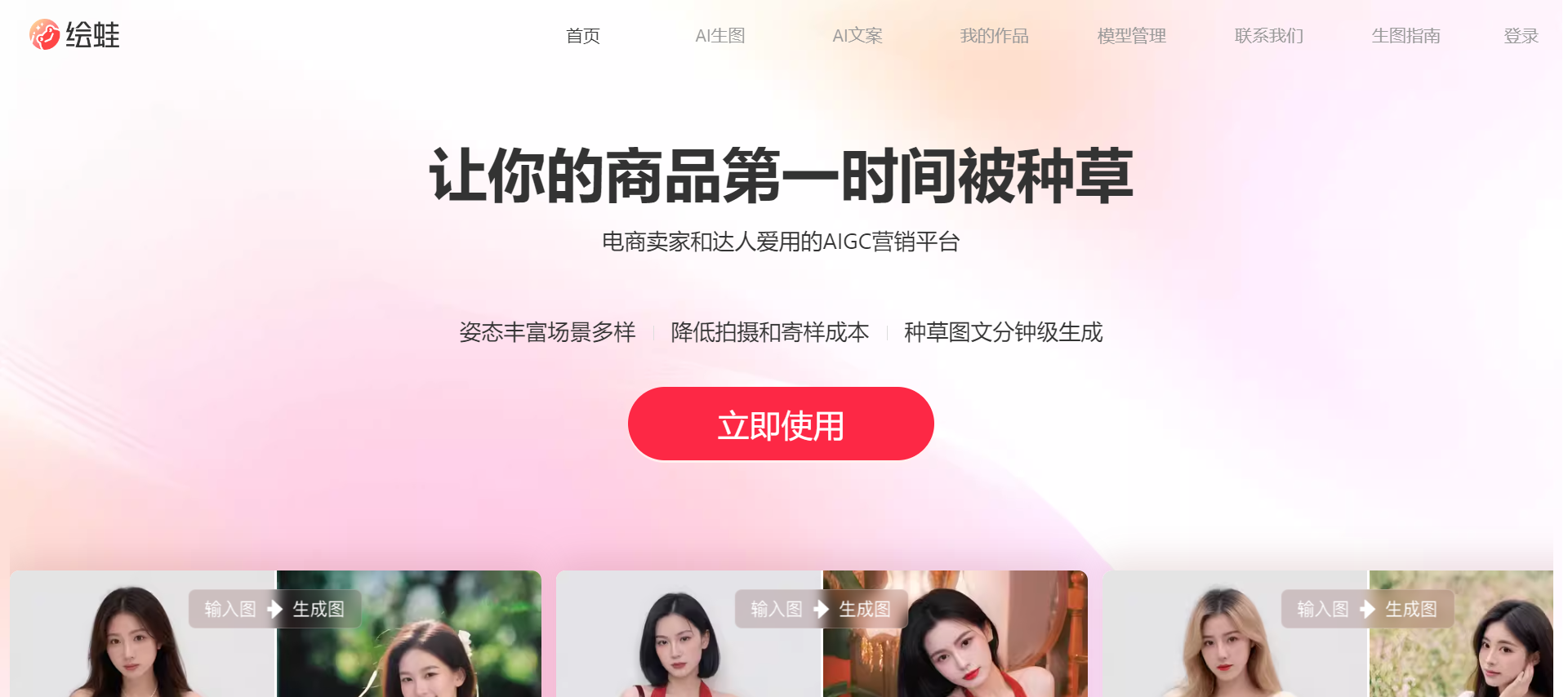 电商场景AI创作平台,无需高薪聘请商拍和文案团队,使用绘蛙即可低成本、批量创作优质的商拍图、种草文案