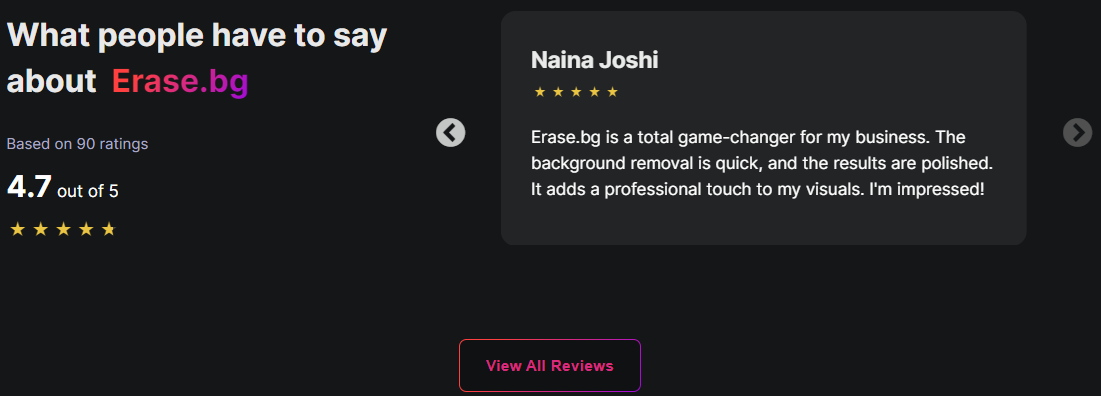 总的来说,Erase.bg 提供了一个简单、快速且有效的方法来移除图片背景,使得用户可以轻松地将图像用于各种设计和创意项目中。在收集的90个评价中获得了4.7的评分。
