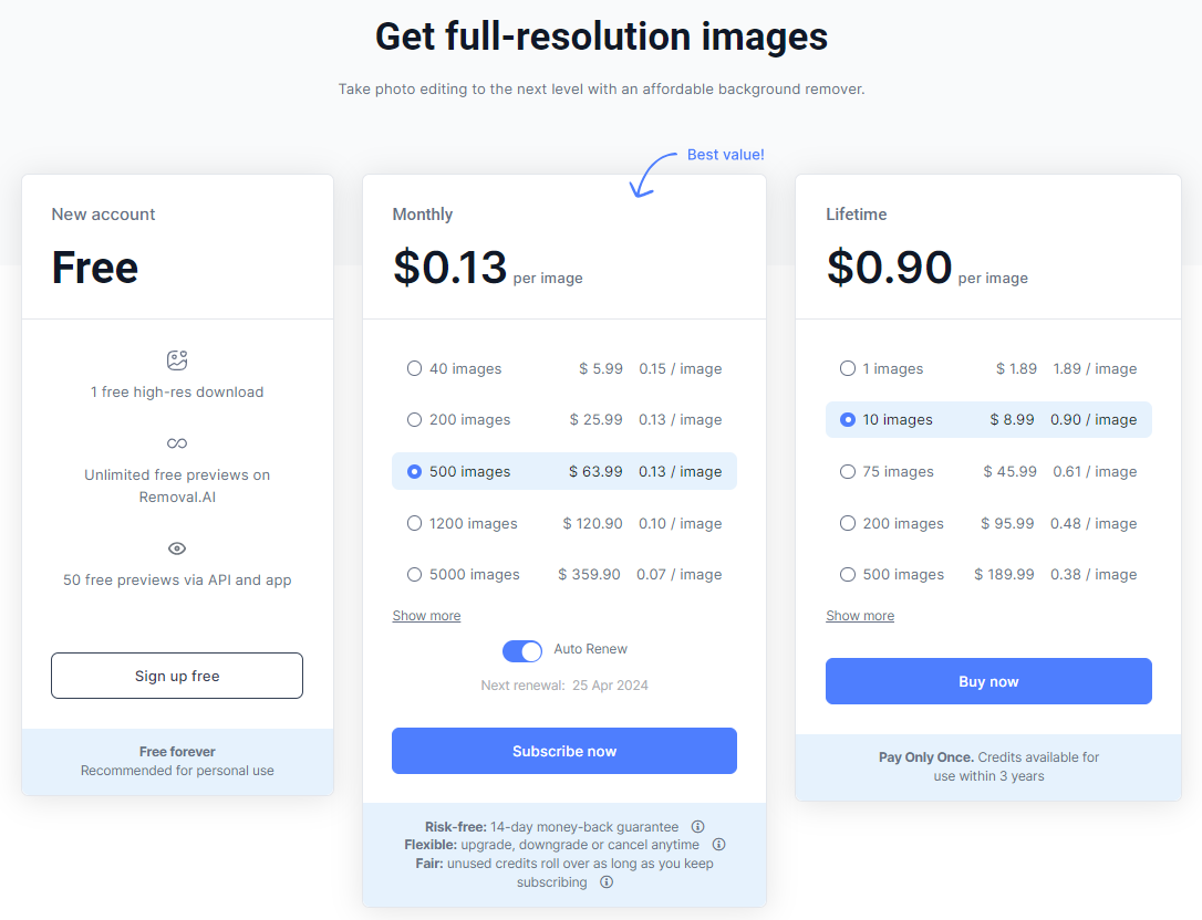 Removal AI 提供了不同的定价计划以满足不同用户的需求。以下是一些定价和收费模式: