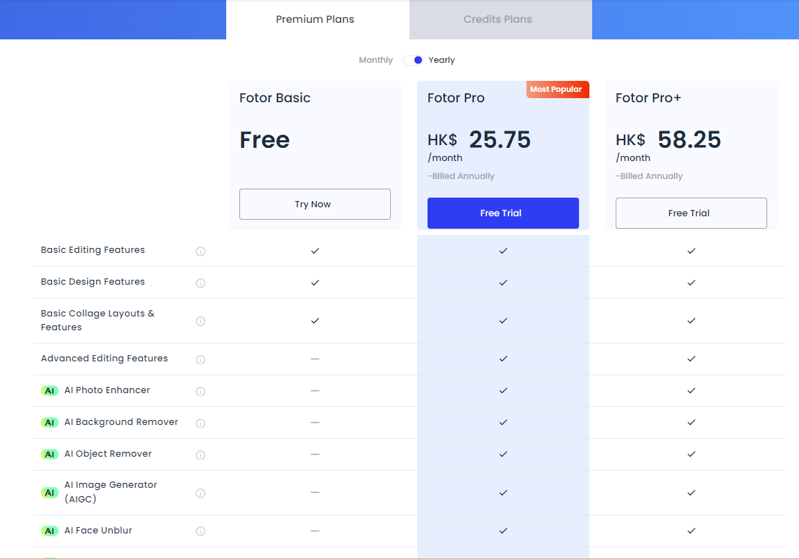 Fotor Pro+的月费是58.25港币。所有计划都提供试用选项。Fotor Pro和Fotor Pro+则提供更高级的功能,包括AI照片增强器、自动背景去除器、AI对象去除器和AI图像生成器(AIGC)等。