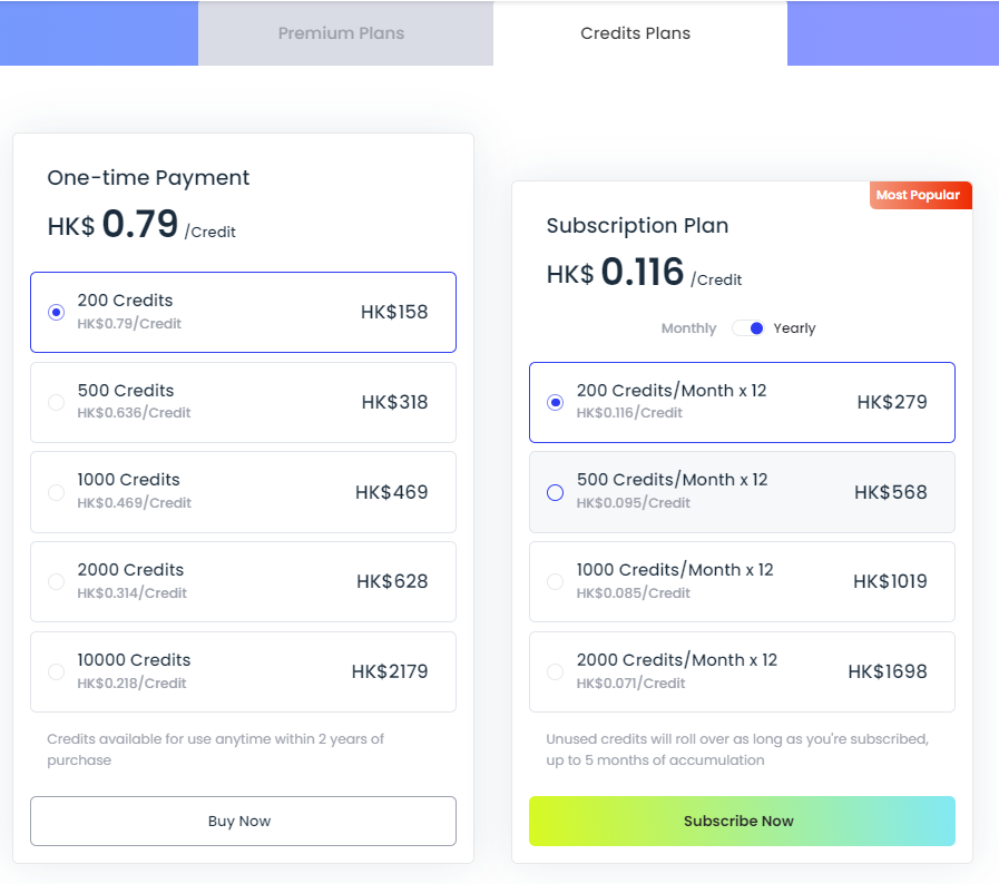 • 每月200积分:HK$279(年付)