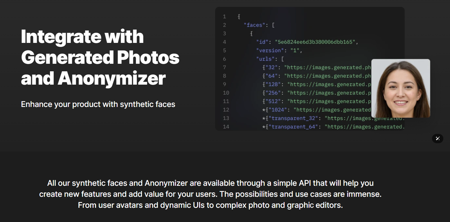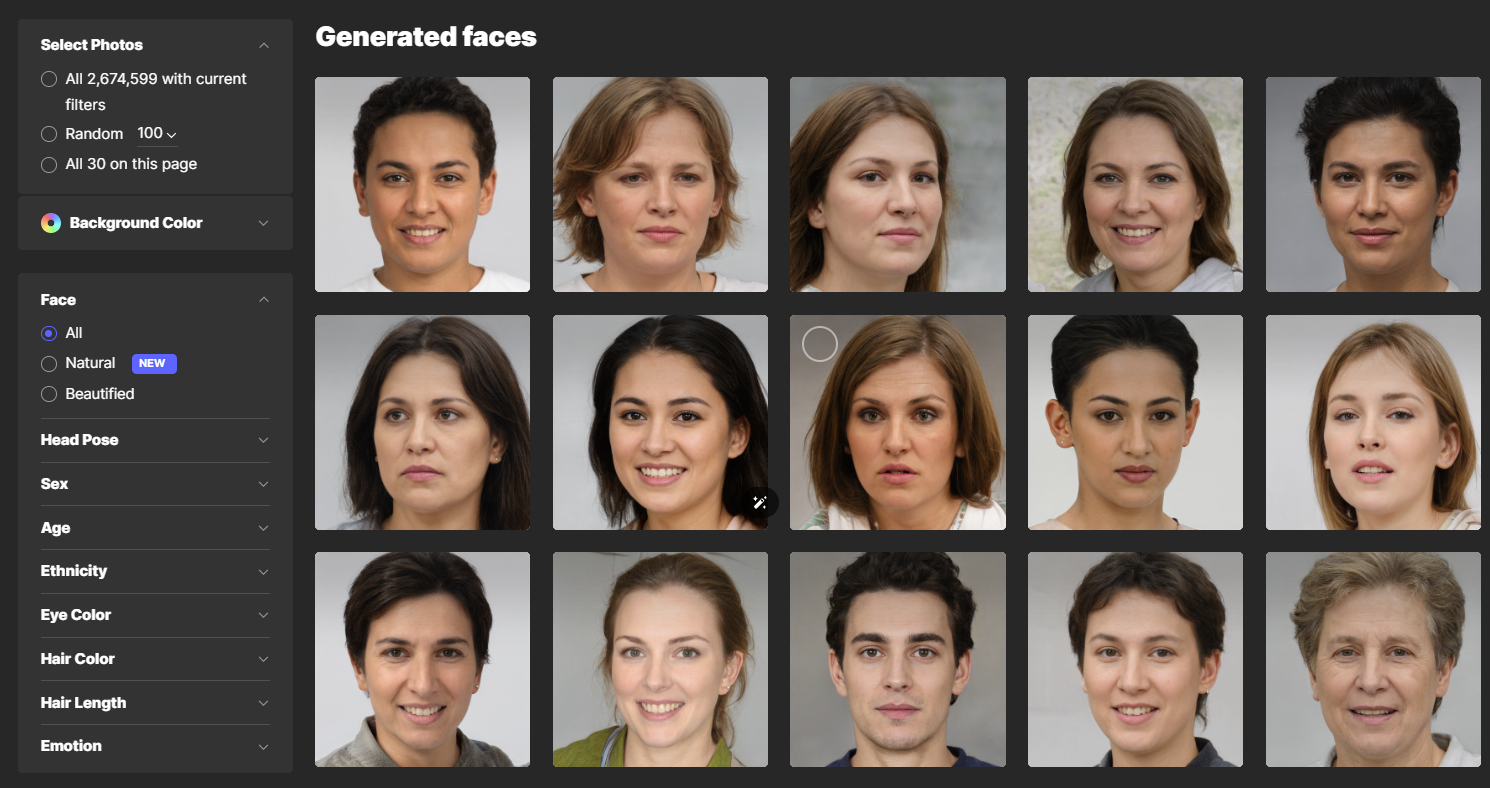 人像图片库:Generated Photos提供了大量由AI生成的模特头像照片,用户可以通过浏览网站或使用API集成来查找和下载所需的图片。