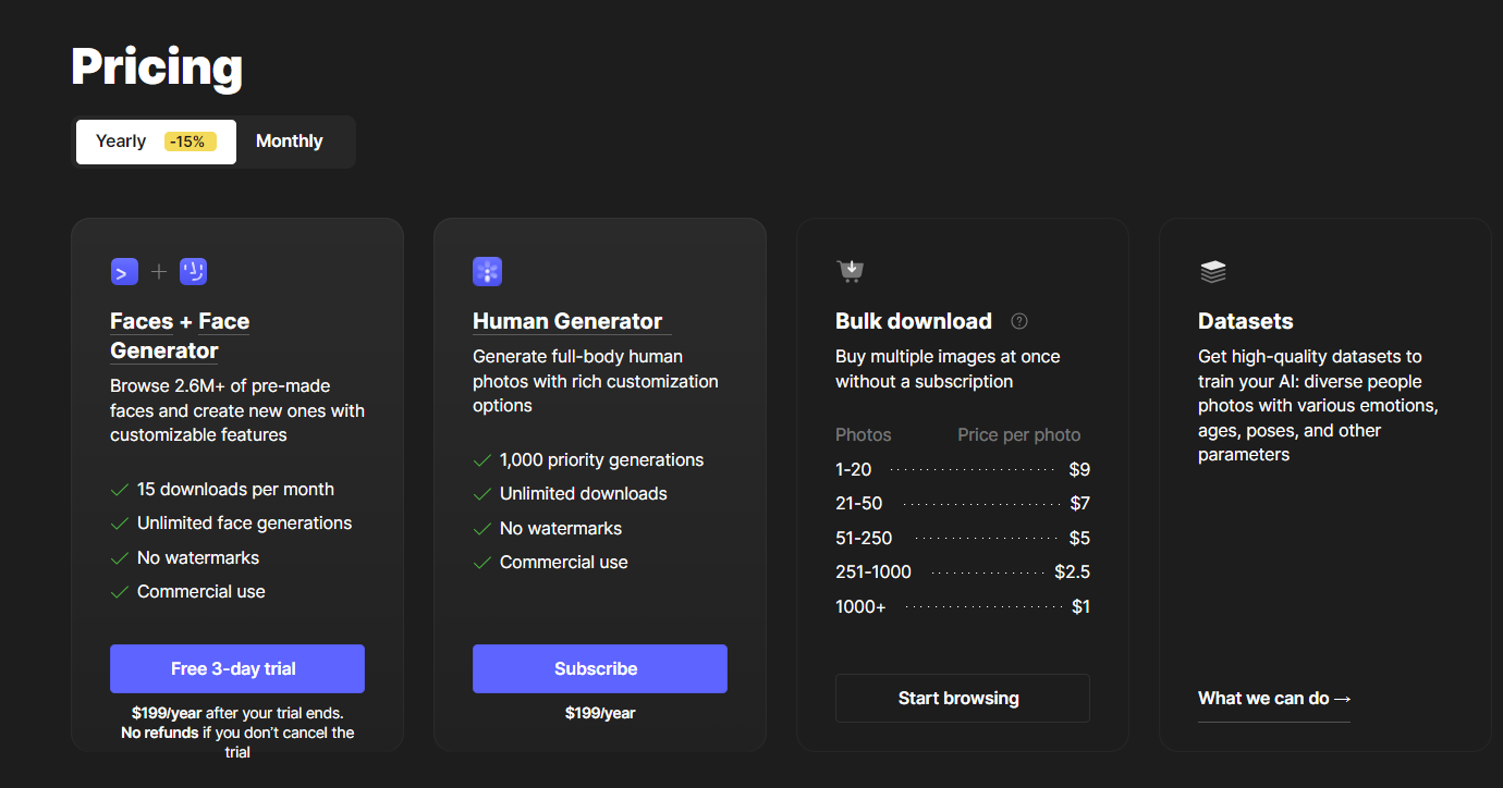 1.面孔+人脸生成器:$199/年,有三天免费试用,每月15次下载,无限面孔生成,无水印,支持商业用途。