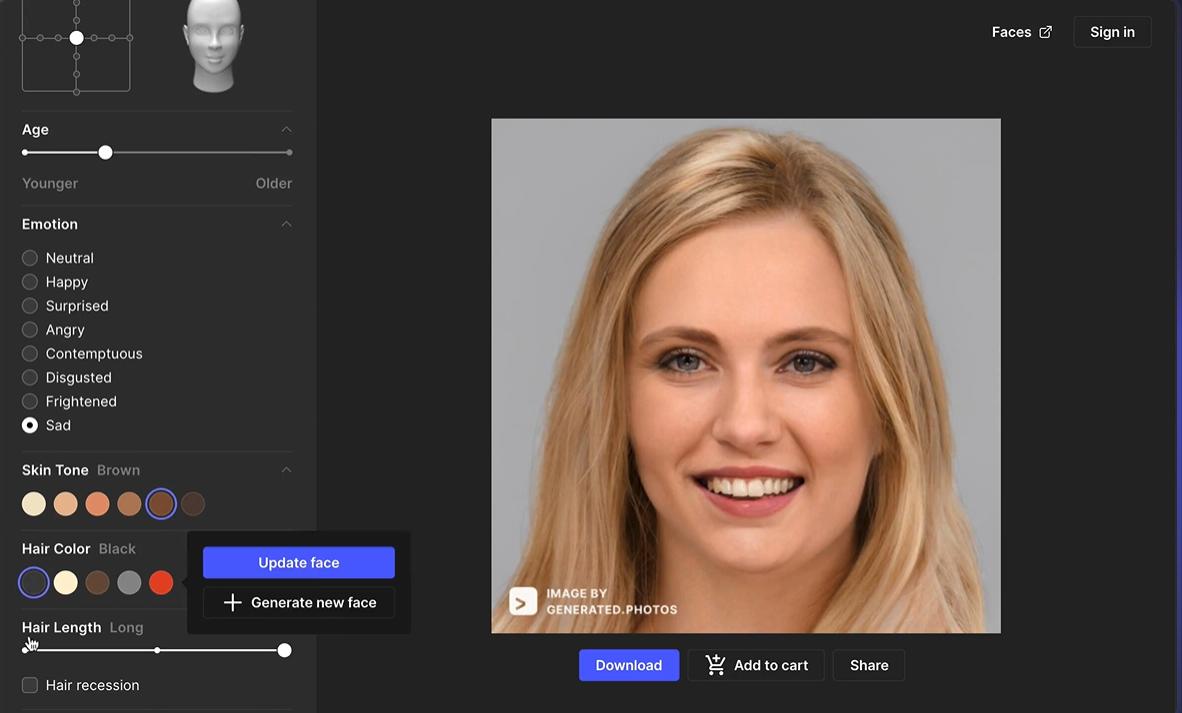 1.设计师:无论是平面设计师、UI设计师还是其他类型的设计师,Generated Photos都能为他们提供大量高质量的模特头像照片。这些图片可以作为设计作品的素材,为设计师提供灵感,并提升设计的整体视觉效果。