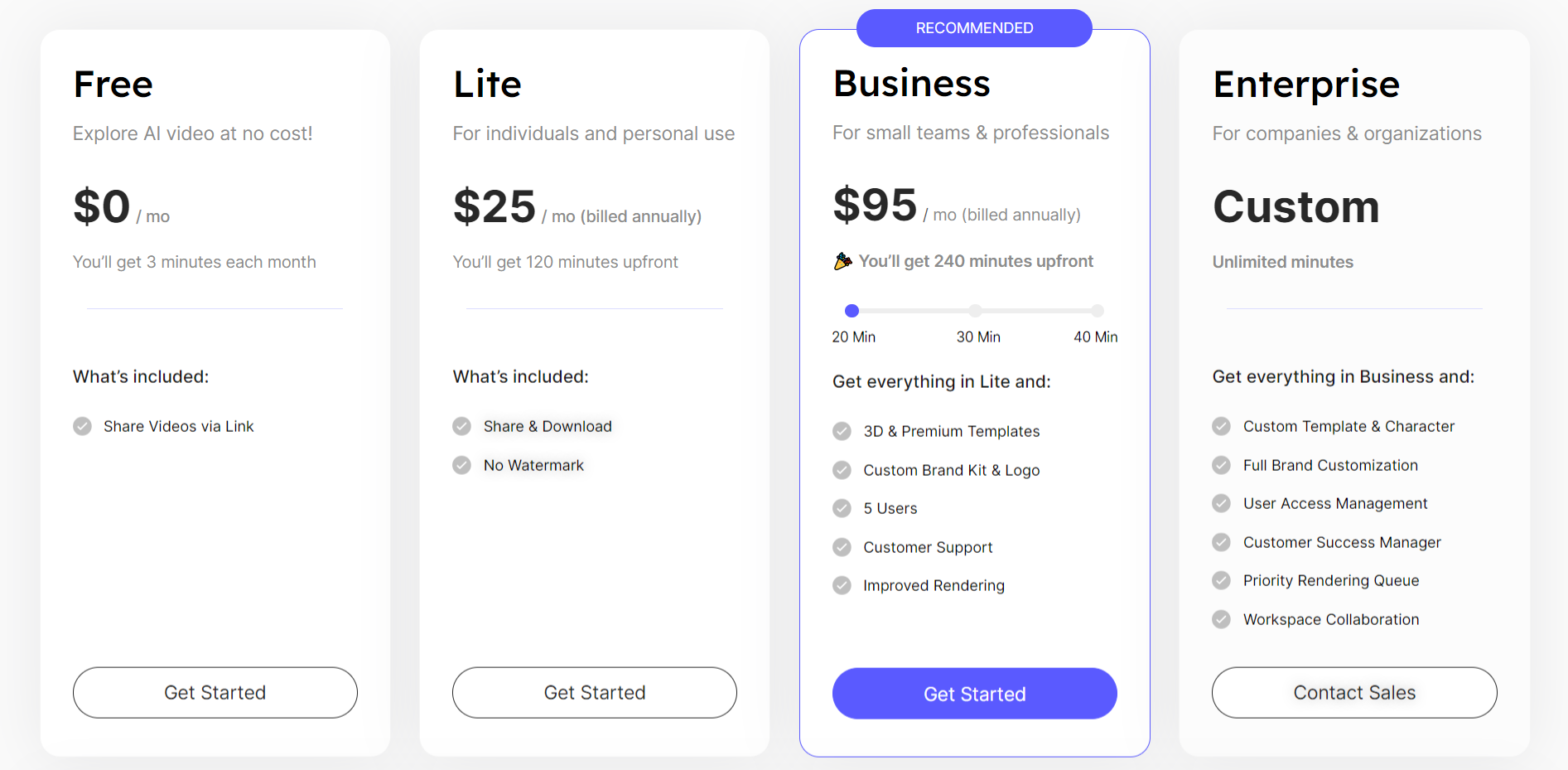 Hour One提供灵活的定价计划,以满足不同用户的需求和预算。他们的免费套餐允许用户在不花费一分钱的情况下探索AI视频,并每月享有3分钟的视频制作时间。对于个人用户和小团队,他们推荐的Lite套餐每月25美元,提供120分钟的视频制作时间,无水印,并包含共享和下载功能。对于专业人士和小型团队,Business套餐每月95美元,提供240分钟的视频制作时间,包括3D和高级模板、定制品牌工具包等功能。而对于大型企业和组织,他们提供定制的企业套餐,拥有无限的视频制作时间,以及定制模板、全面品牌定制、用户访问管理等高级功能。