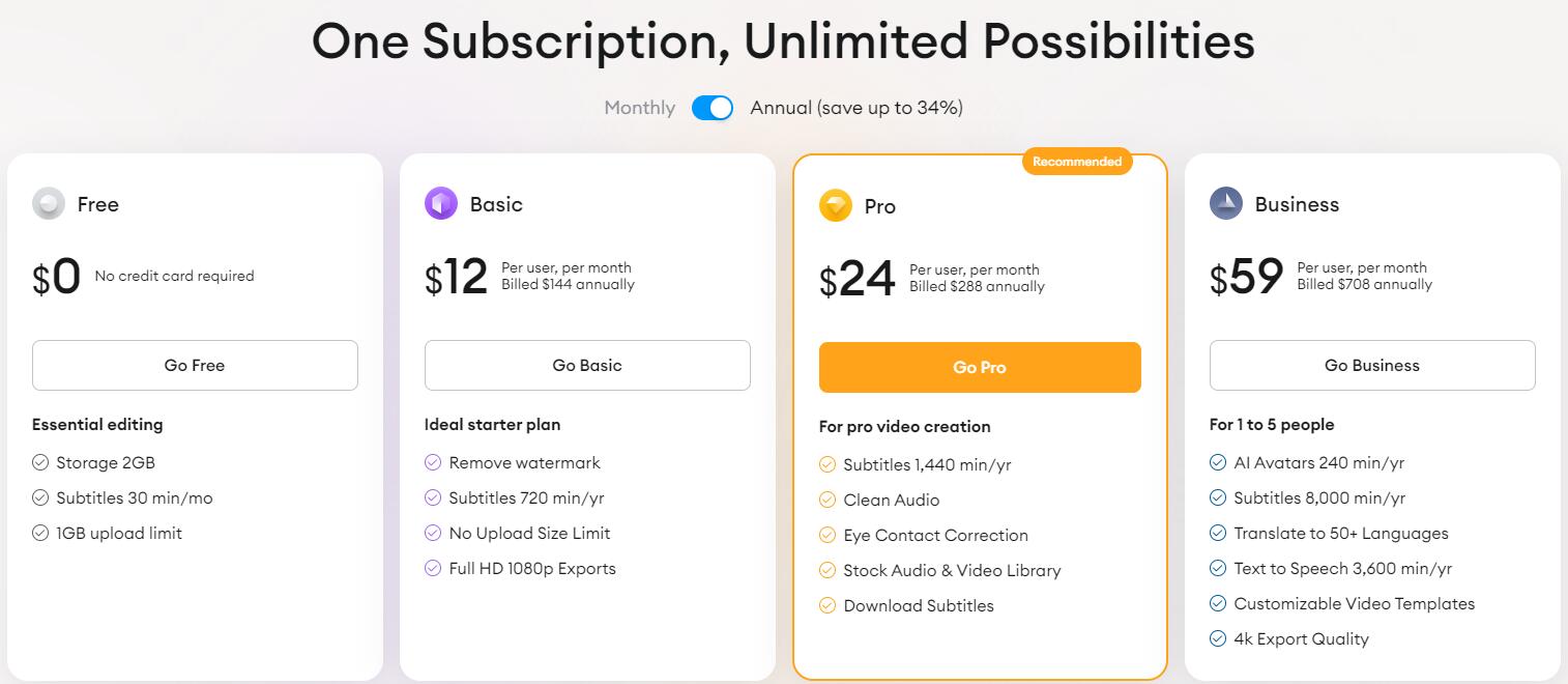 VEED.IO分为免费版、基础版、专业版和企业版。免费版的可以免费使用,但功能非常有限。基础版的每月18美元,订阅一年的话每月12美元。专业版的每月30美元,订阅一年的话每月24美元。企业版的每月70美元,订阅一年的话每月59美元。