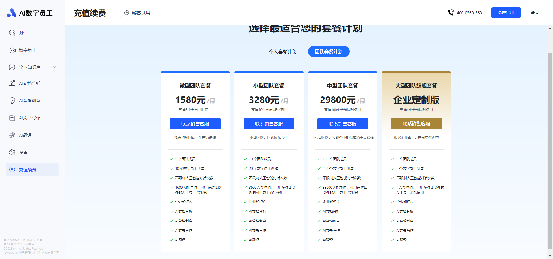 360数字员工的团队套餐计划提供了四种不同档次的定价方案,包括微型团队套餐、小型团队套餐、中型团队套餐和大型团队旗舰套餐。