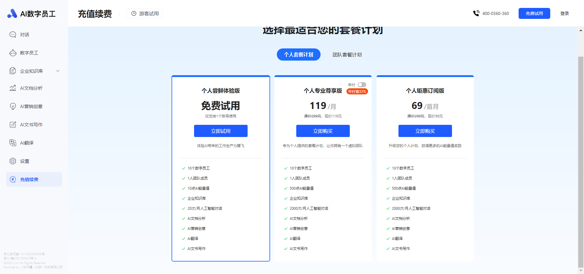 360数字员工的个人套餐计划提供了三种不同档次的定价方案,包括个人尝鲜体验版、个人专业尊享版和个人钜惠订阅版。
