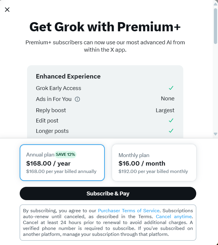 Grok支持月付和年付,年付享有最高12%的折扣。