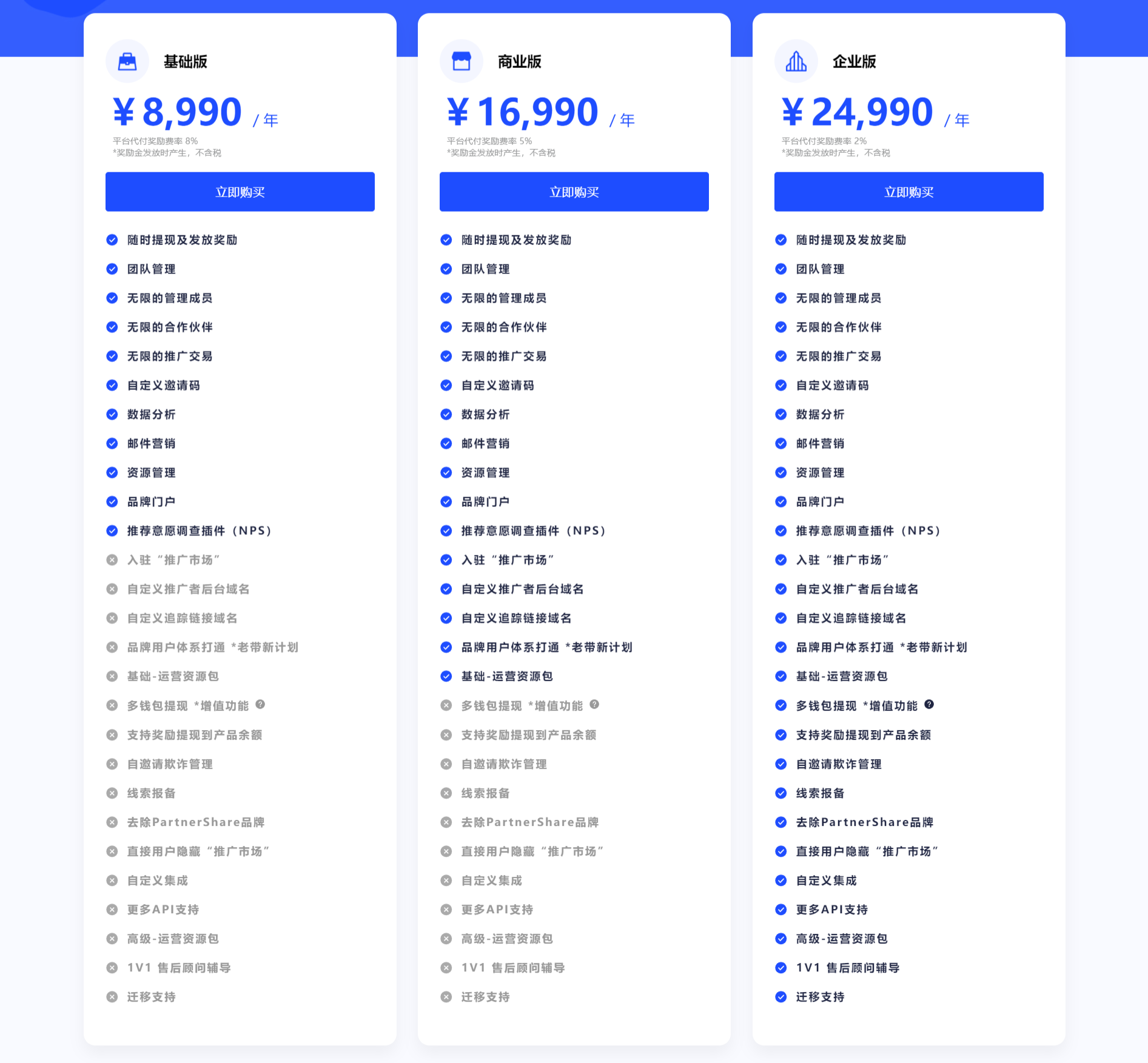 PartnerShare提供三种定价计划,适用于各类SaaS企业:基础版、商业版和企业版。这些计划包括平台代付奖励、团队管理、无限的合作伙伴和推广交易、数据分析、邮件营销等关键功能。每个计划都配备自定义邀请码、品牌门户、推荐意愿调查插件(NPS)以及自定义追踪链接域名等功能,帮助企业实现增长和推广的目标,提升品牌力和销售效果。高级的运营资源包和1V1售后顾问辅导确保企业在使用过程中得到专业支持。