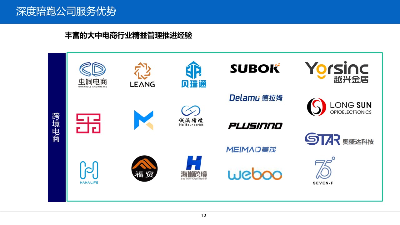 跨境电商行业第一个能提供从战略到经营管理、从市场管理到销售管理,从产品开发到产品实现,从计划到物流、从采购到供应商管理到制造工厂管理全流程陪跑团队。团队善于研究总结、落地实践,能从底层逻辑开始构建经营管理体系和架构,通过大量实践验证,升华为方法论。并通过陪跑实践再次落地成为管理与作业行为,为企业破译增量密码。通过5年的行业锤炼,一批批客户已经从我们总结的方法论、增长逻辑实操应用中获益,获得持续高增长动能。